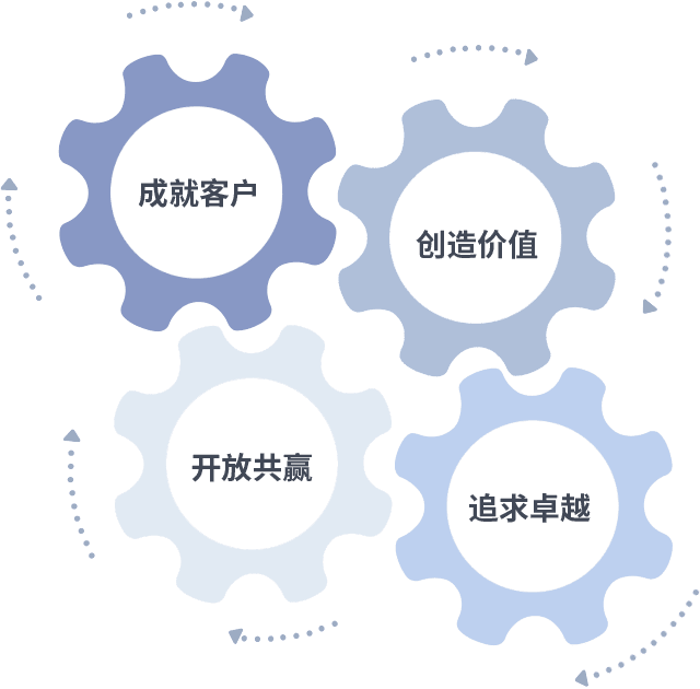 成就客户是一切决策的出发点,,,创造价值是衡量所有工作的标准,,,,追求卓越是我们做事做人的态度,,,开放共赢是我们的格局也是最终的结果。。。价值观的齿轮环环相扣,,,推动着组织里的每个人不断向前。。。。